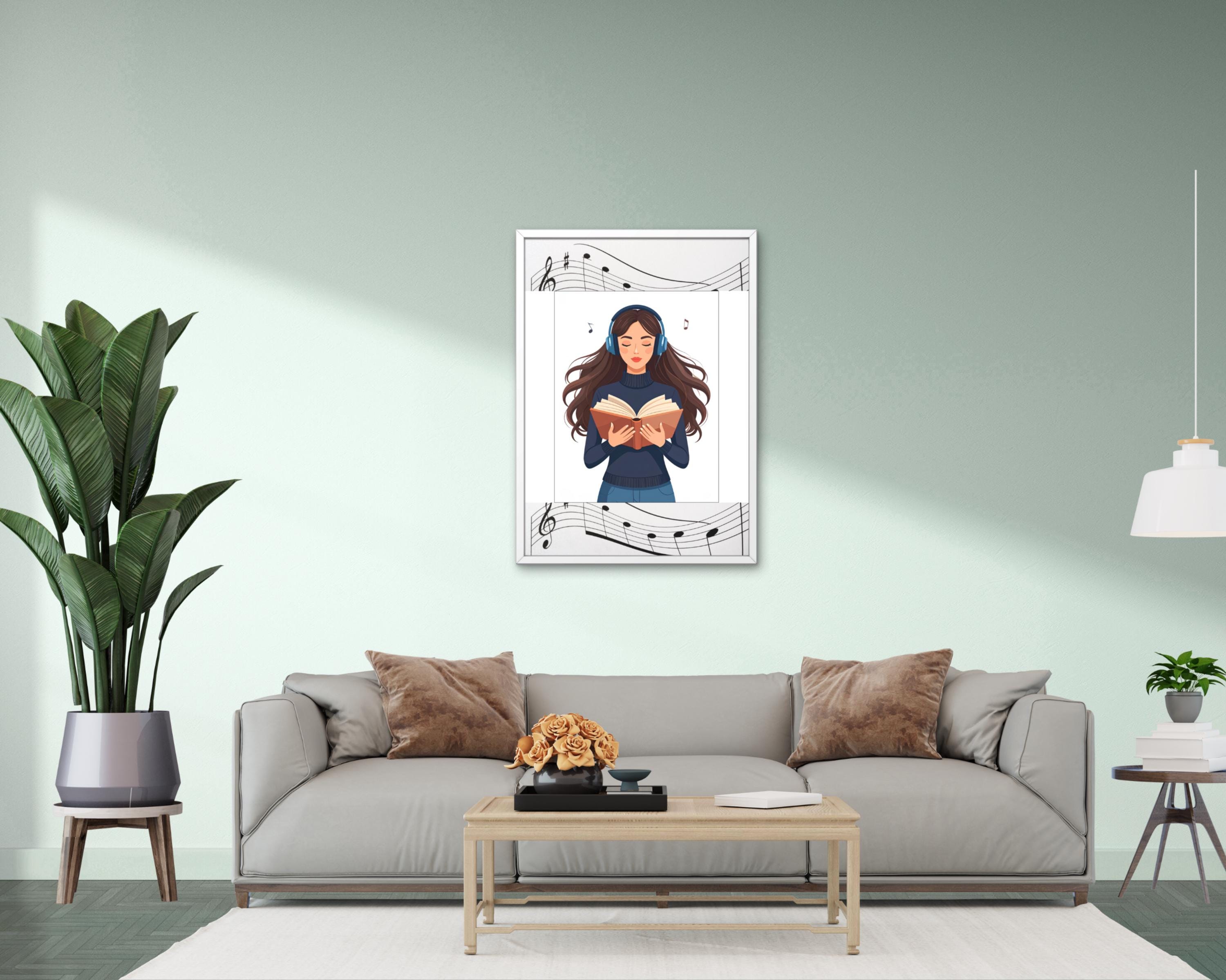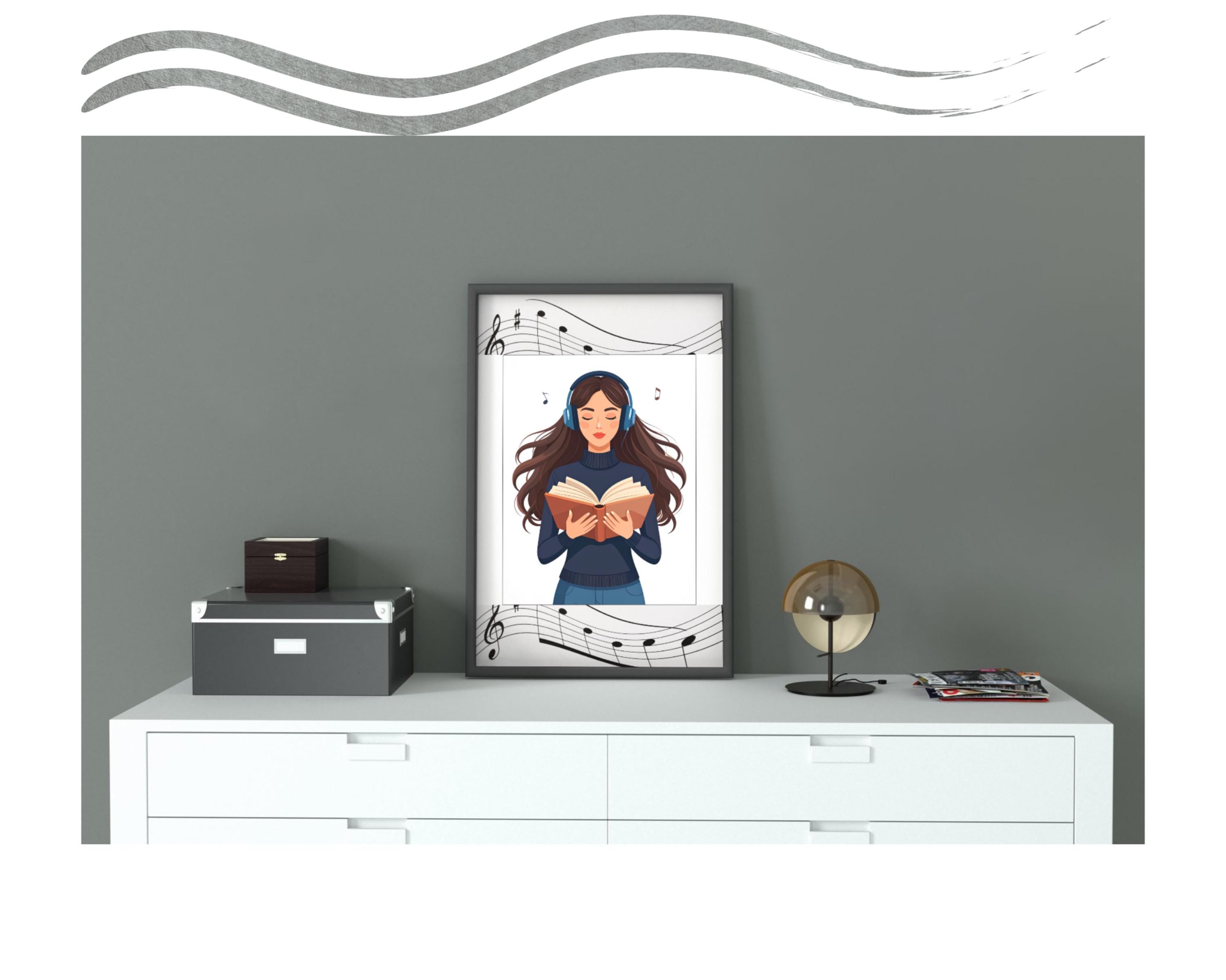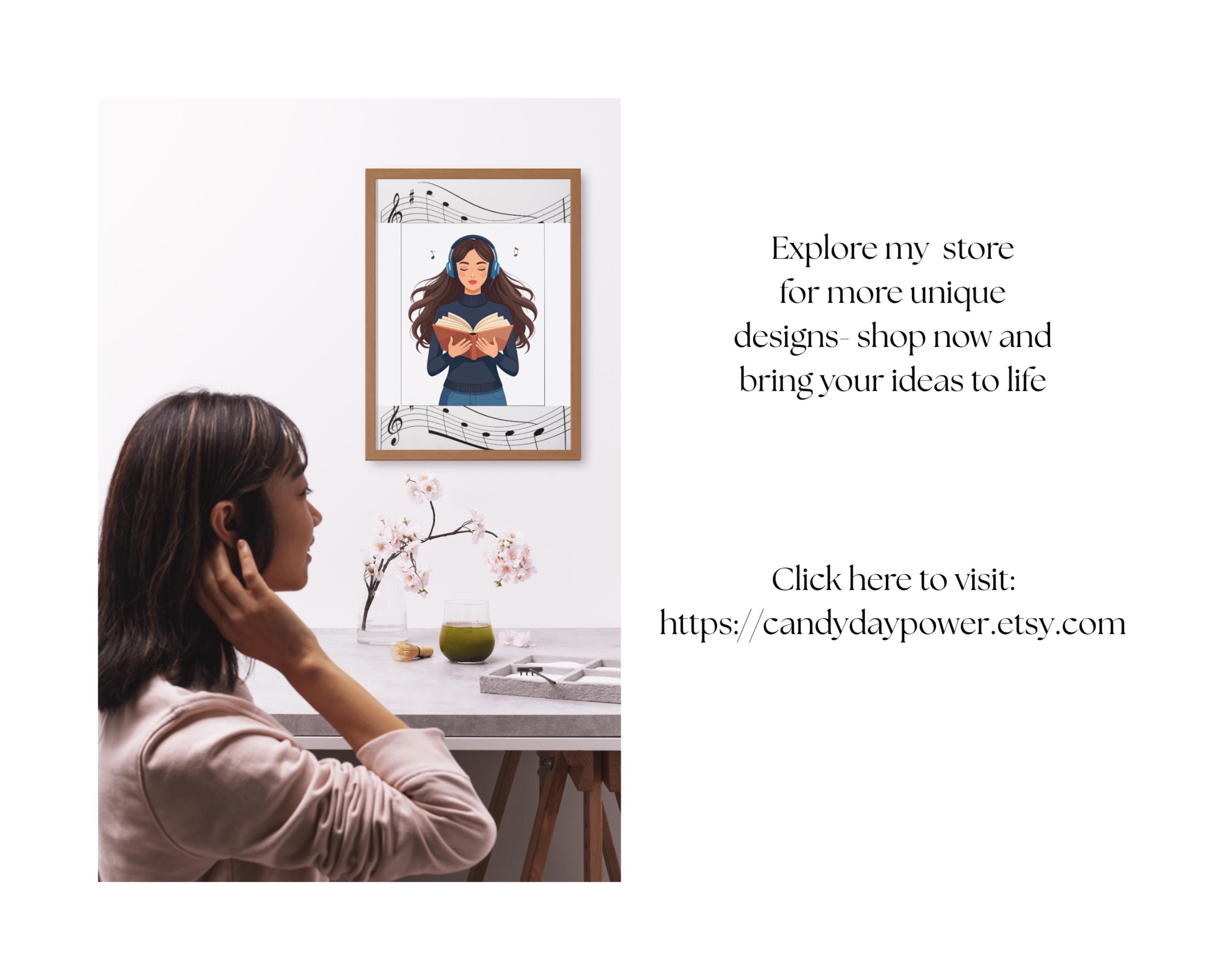 “Transform your space with this enchanting ‘Music and Book Wall Art Collection’! Featuring a serene illustration of a woman reading with headphones, surrounded by musical notes, this set brings harmony and inspiration to any room. Perfect for book lovers, music enthusiasts, or anyone seeking a cozy aesthetic.