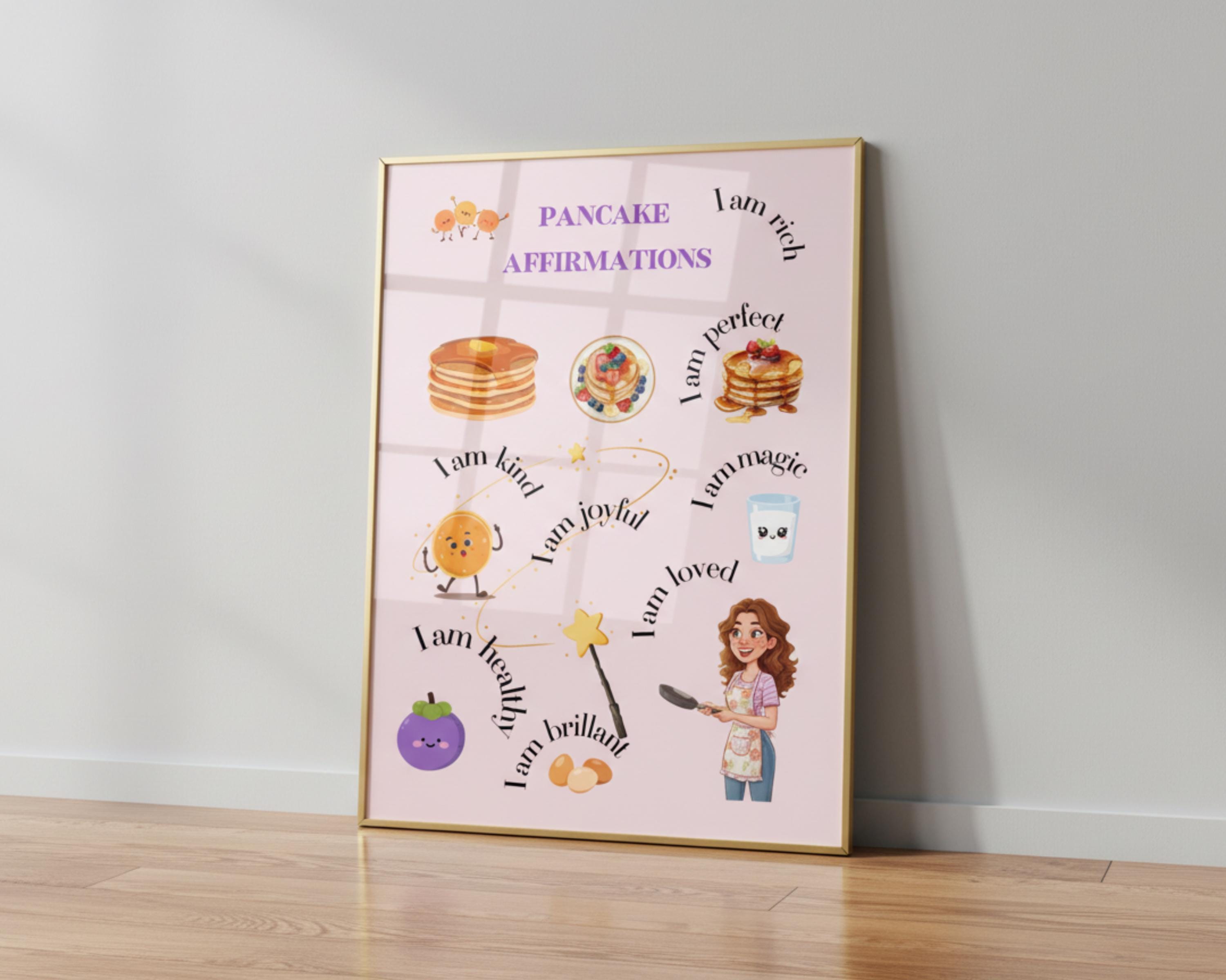 • Pancake Affirmations Poster: Fun pancake-themed affirmations such as “I am kind,” “I am joyful ” “I am power” “I am loved,” and more, paired with playful illustrations to encourage self-love and confidence during morning meals.