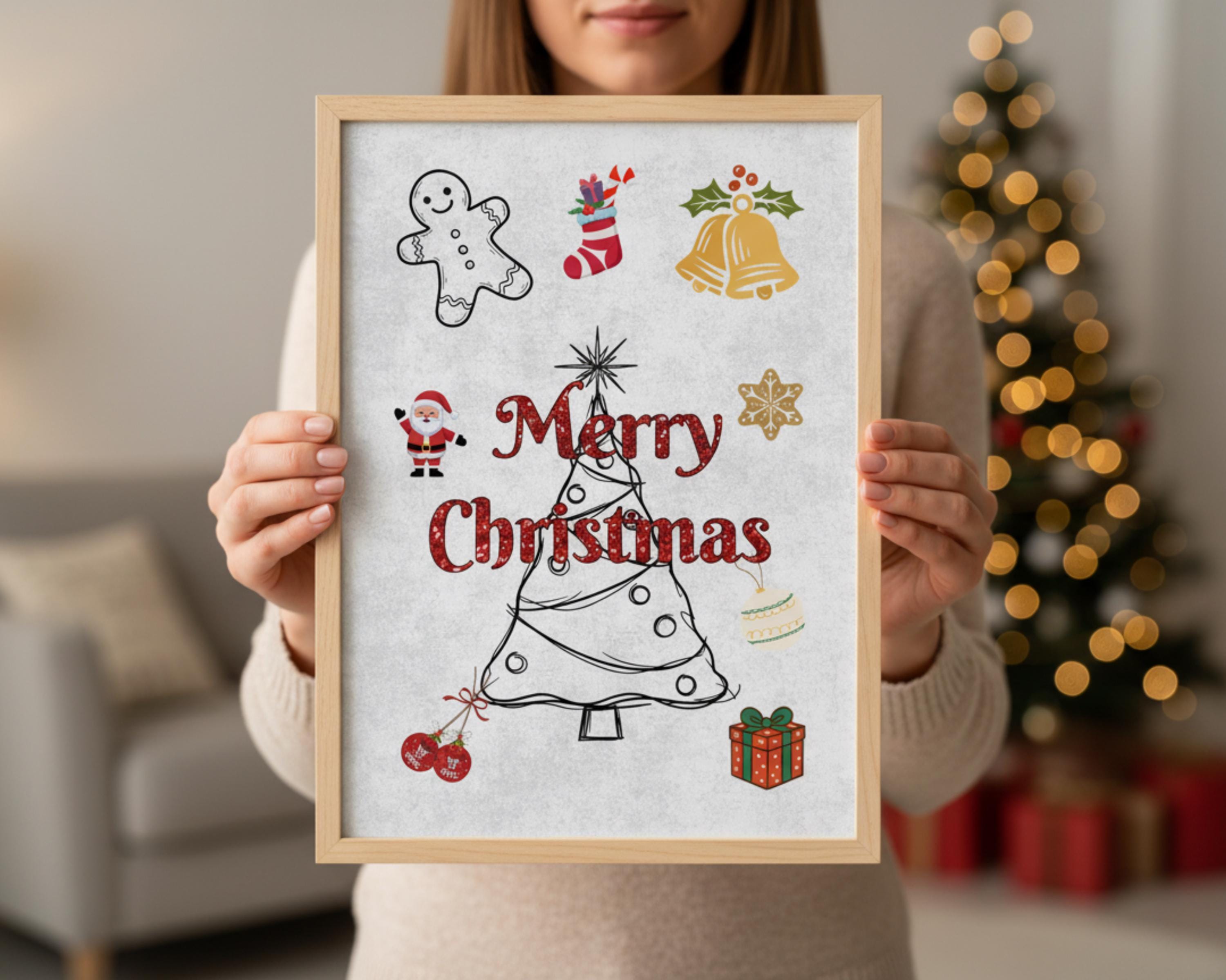 Add a touch of festive cheer to your home with this adorable “Merry Christmas” printable wall art! Featuring cute doodle-style illustrations like a gingerbread man, Santa Claus, Christmas tree, stocking, bells, snowflake, cake, ornaments, and a gift box, all on a subtle textured background. Perfect for holiday decor, framing, or gifting.