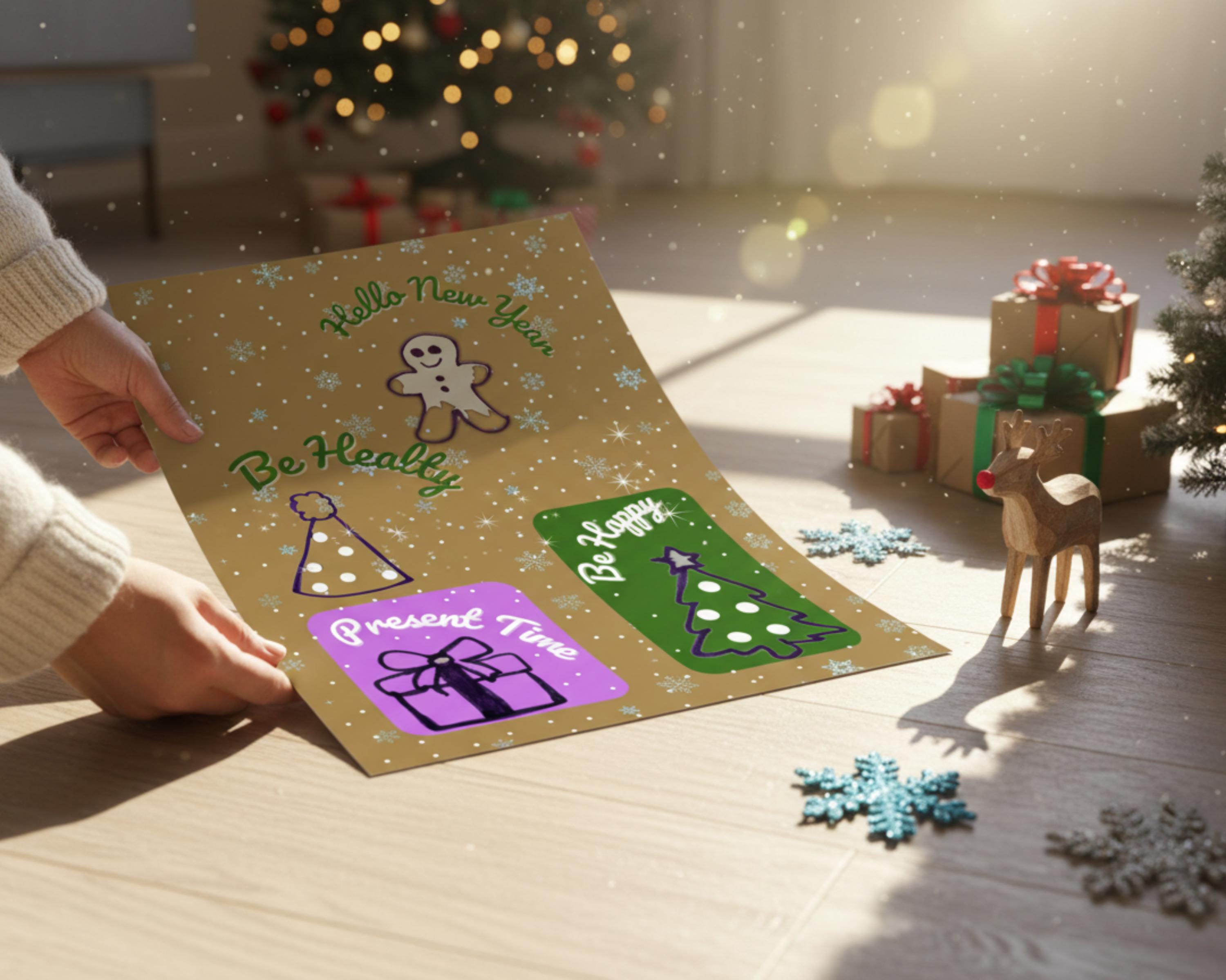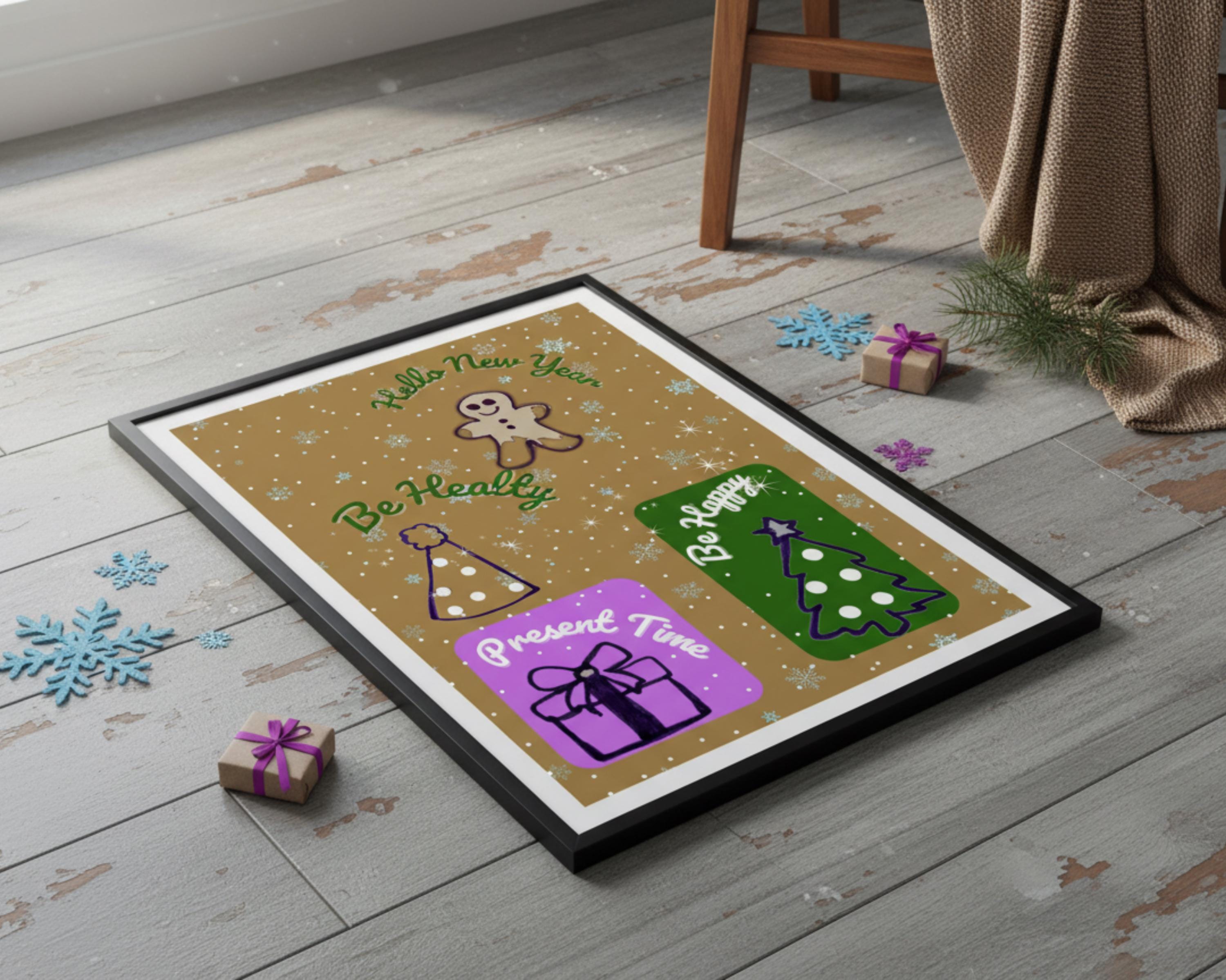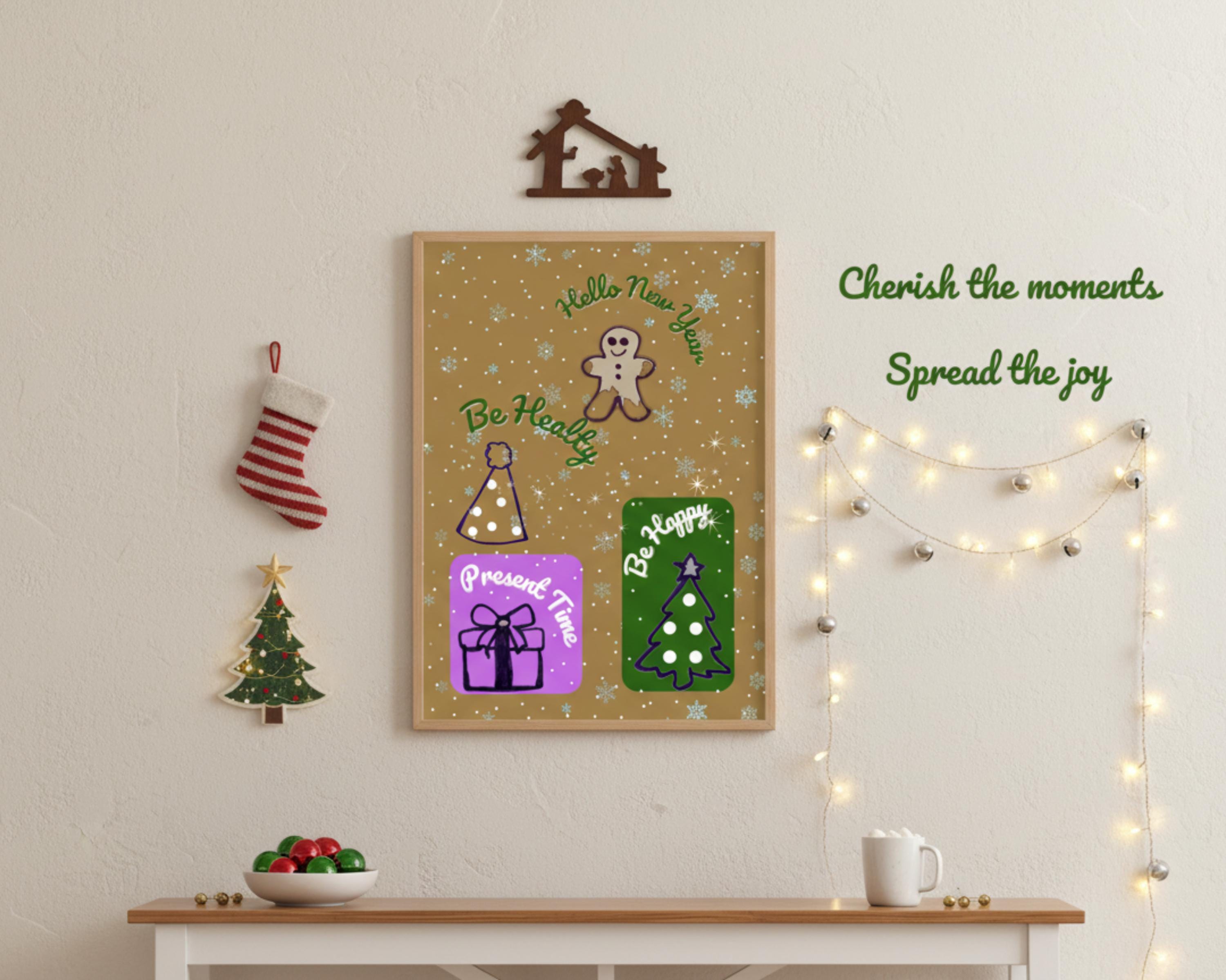 This fun design featuring a gingerbread man, party hat, and Christmas tree will brighten up your home or office.