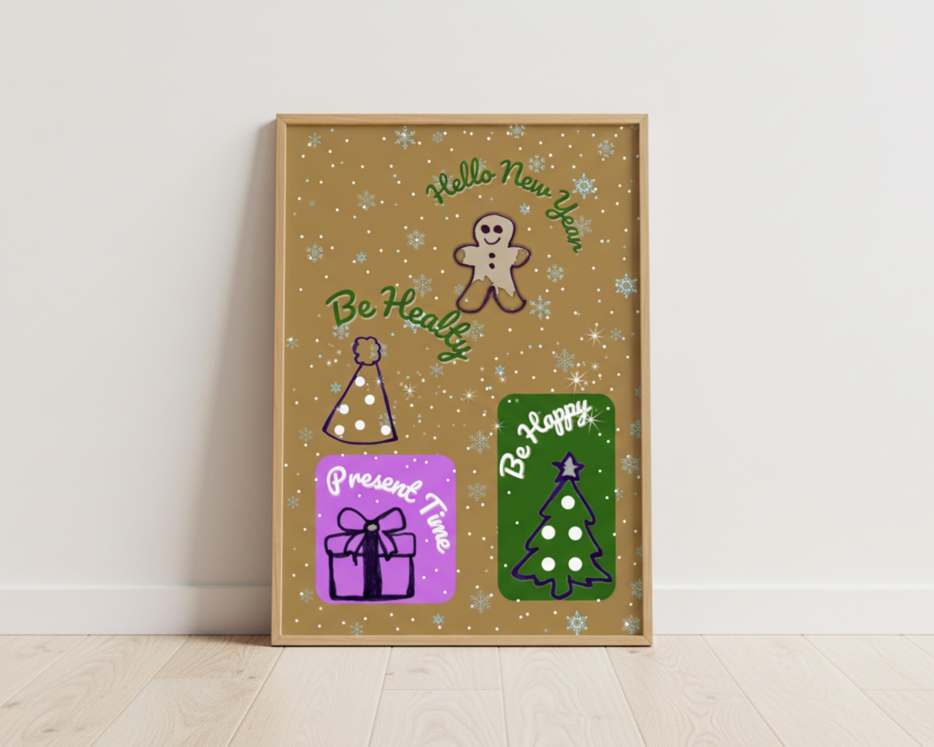 Hello New Year Gingerbread Poster-Hand-Drawn Holiday Print A2 A3 A4 Instant Download